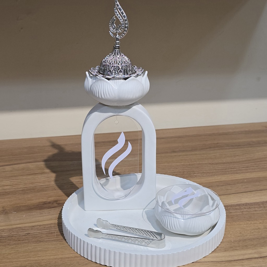 بخورسوز بتنی طرح گل با طراحی خاص و مینیمال. روی درب جای بخور از پلکسی شفاف استفاده شده که امکان نصب لیبل اختصاصی با نام عروس و داماد را فراهم میکند.و همینطور روی بخور سوز پلکسی گنبدی با لیبل اختصاصی اول اسم عروس و داماد قرار میگیرد. این محصول انتخابی شیک و متفاوت برای هدیه عروسی، یادبود مراسم و دکوراسیون منزل است.